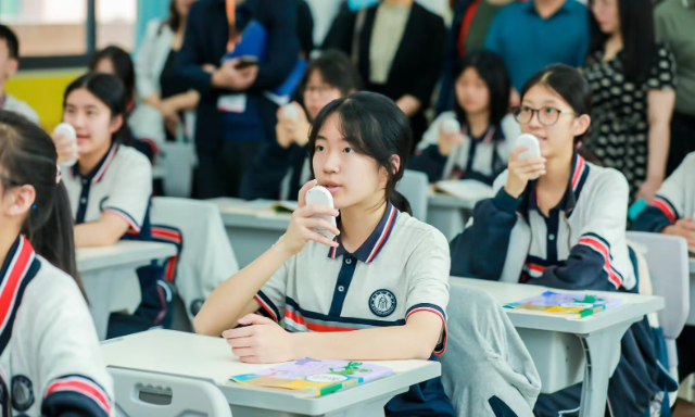 西附星辰中學AI聽說課堂上,學生手持語音答題器朗讀短文。 學校供圖