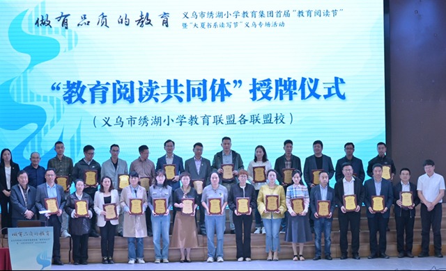 當天,義烏市繡湖小學教育聯盟“教育閱讀共同體”授牌儀式在繡湖小學舉行,并為31所聯盟校授牌。“教育閱讀共同體”的成立,將為繡湖小學教育聯盟的全體教師提供一個交流學習、共享資源的平臺,推動聯盟校間互相交流、學習、成長、進步。