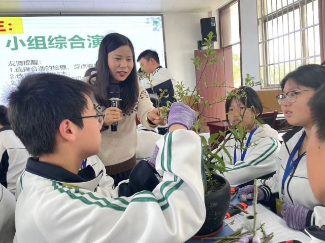 高郵市湯莊鎮沙堰初級中學陳玉萍老師在指教勞動技術課“花木嫁接”