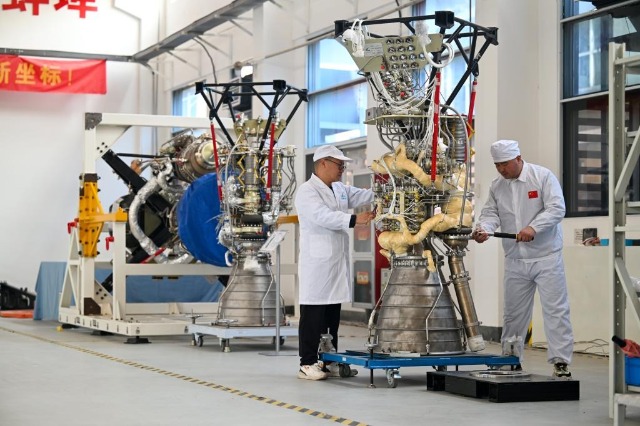 2024年3月11日,在安徽九州云箭航天技術(shù)有限公司生產(chǎn)基地,技術(shù)人員對(duì)即將交付的液體火箭發(fā)動(dòng)機(jī)進(jìn)行最后的檢查。 新華社發(fā)(黃洋洋 攝)
