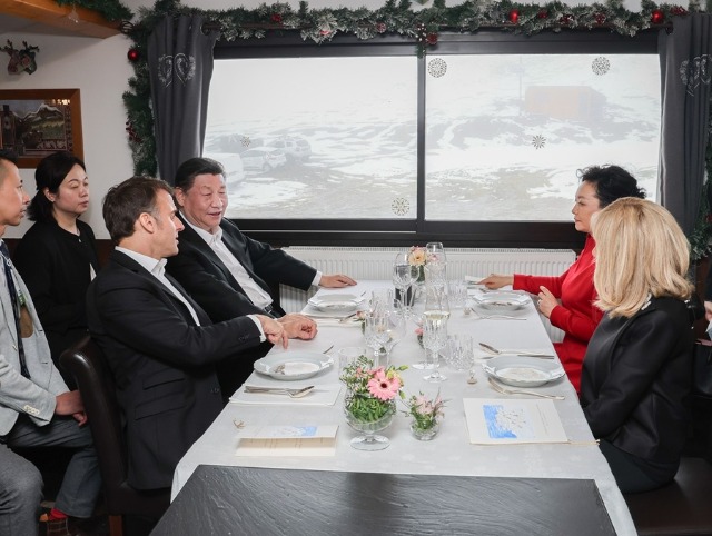 當(dāng)?shù)貢r(shí)間5月7日,應(yīng)法國(guó)總統(tǒng)馬克龍?zhí)貏e邀請(qǐng),國(guó)家主席習(xí)近平乘專機(jī)來(lái)到法國(guó)西南部上比利牛斯省訪問(wèn)。在圖爾馬萊山口“牧羊人驛站”,習(xí)近平和夫人彭麗媛同馬克龍和夫人布麗吉特憑窗而坐,在輕松愉快的氛圍中就一些重要問(wèn)題進(jìn)行戰(zhàn)略溝通。新華社記者 姚大偉 攝