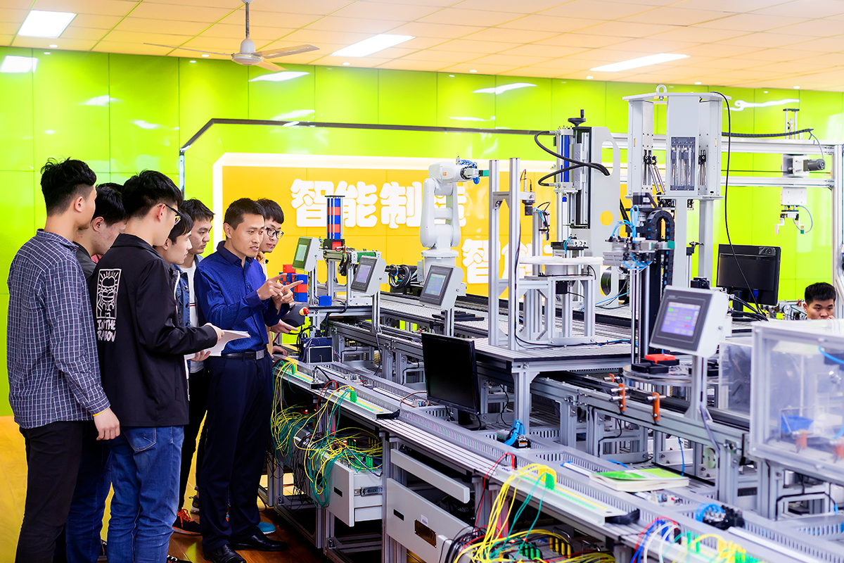 智能制造生產線實訓系統是對工業現場大型設備進行提煉和濃縮的一款小型智能制造生產線實訓設備,來到工業元宇宙學院,采訪團一行看到學生們正在授課老師帶領下進行智能制造實訓。