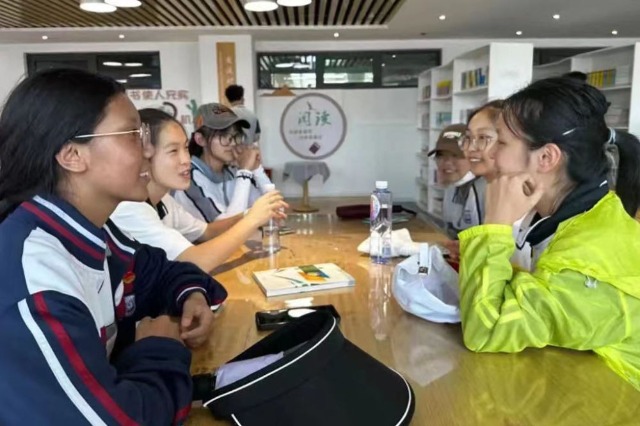 2023年7月10日,在果洛西寧民族中學,上海市大同中學學生(右)與果洛西寧民族中學學生交流。新華社發(果洛州教育局供圖)