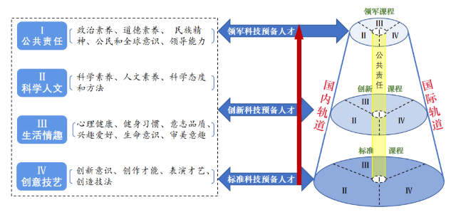 根據中國學生發展核心素養的要求,學校構建了“一軸兩軌三層四類”的“錐形”課程體系。一軸是指公共責任類課程;兩軌是指國際軌道、國內軌道;三層是指標準層、創新層、領軍層;四類是指Ⅰ公共責任、Ⅱ科學人文、Ⅲ生活情趣、Ⅳ創意技藝,由此形成以分層分類為原則、內容豐富且結構合理的課程體系。
