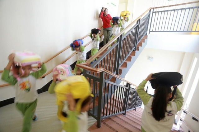 2023年10月13日,江蘇省揚州大學附屬西郡幼兒園的老師組織小朋友進行逃生演練。新華社發(孟德龍 攝)