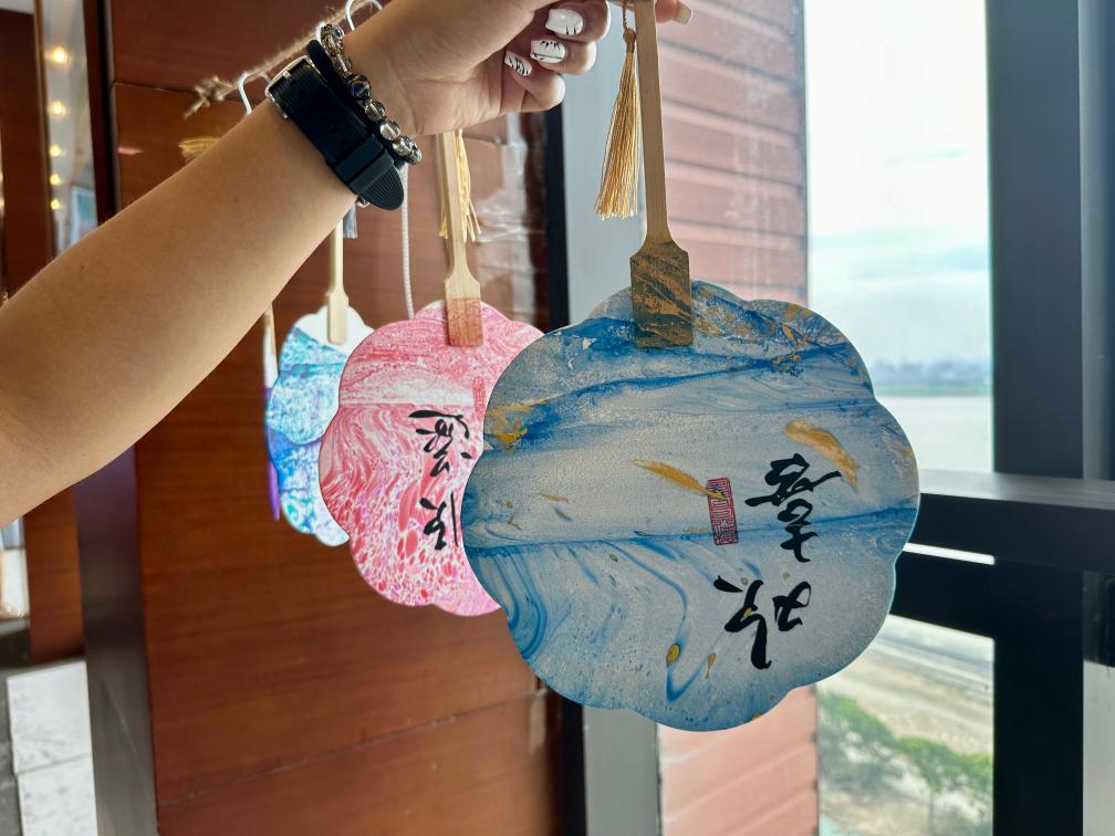 7月9日,美國青少年在浙江省杭州高級中學(xué)學(xué)生幫助下制作的漆扇正在晾干。新華社記者 袁睿 攝