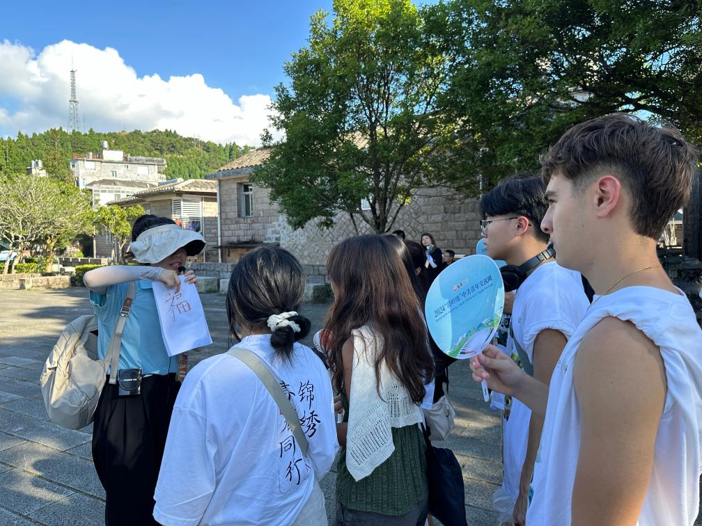 7月6日,美國青少年在福州鼓嶺聽導(dǎo)游講解“?!弊值暮x。新華社記者 袁睿 攝