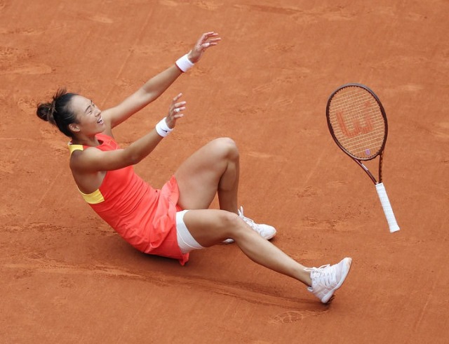 中國選手鄭欽文在巴黎奧運會網球女子單打金牌賽后慶祝奪冠(2024年8月3日攝)。新華社記者 高靜 攝