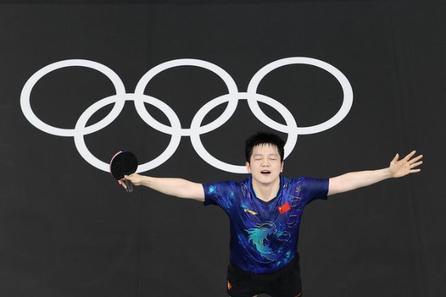 中國選手樊振東在巴黎奧運會乒乓球男單四分之一決賽中戰勝日本選手張本智和,晉級四強(2024年8月1日攝)。新華社記者 徐子鑒 攝