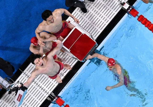 3分27秒46,中國游泳隊成功打破美國隊在該項目奧運金牌上40年的壟斷,勇奪男子4X100米混合泳接力金牌。徐嘉余說:“和隊友并肩作戰,我感覺特別有勁!”第三棒的孫佳俊說,平時戰術是堅持5米不換氣,在決賽最后沖刺階段,自己堅持了8米,“這次我必須拿出極限狀態,為潘展樂爭取時間”。