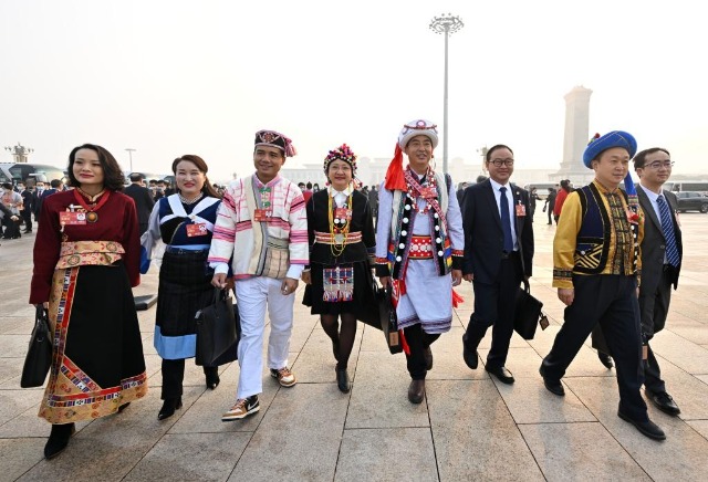 2023年3月5日,第十四屆全國人民代表大會第一次會議在北京人民大會堂開幕。這是全國人大代表走向會場。新華社記者陳益宸攝