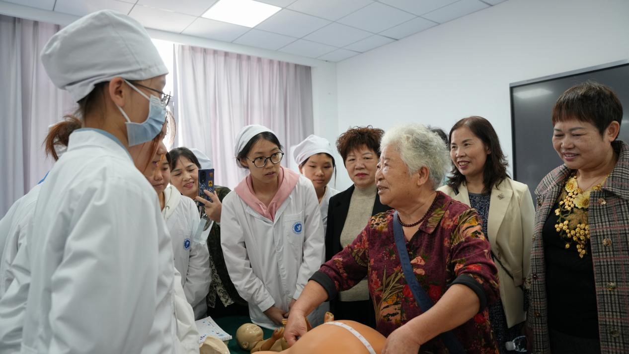 回到熟悉的課堂,退休20年的陳香蓮老師不由走上了講臺,一邊利用輔助教具比畫著,一邊跟學生講述如何通過四步觸診法判斷胎兒的大小和羊水量。“在孕婦做檢查時,一定要面帶微笑,動作輕柔,就像對待你們自己的姐姐一樣……”陳老師細心囑咐道。相差整整40屆的學姐和學妹,緊緊圍在陳老師兩邊,聆聽諄諄教誨。