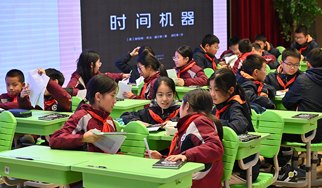 南京市金陵小學的課堂里,教師付海亮正帶領學生上整本書閱讀課《時間機器》。學生提出了很多問題,為什么會分化出埃洛伊和莫洛克這兩類人?80萬年后的人類真的會變成這樣嗎?是否存在避免這種倒退的可能性?