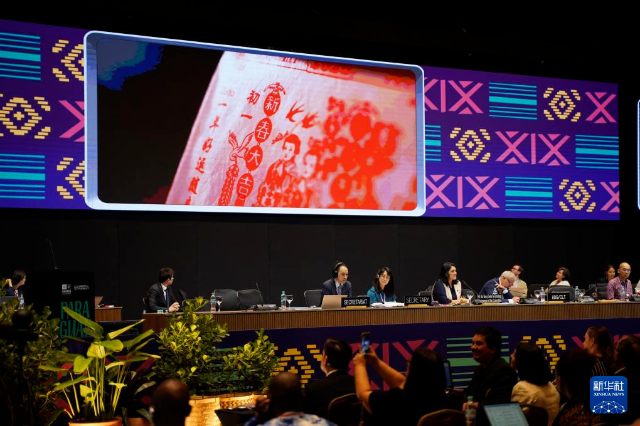 12月4日,在巴拉圭亞松森聯合國教科文組織保護非物質文化遺產政府間委員會第19屆常會評審現場,大屏幕播放春節宣傳視頻。新華社記者 朱雨博 攝