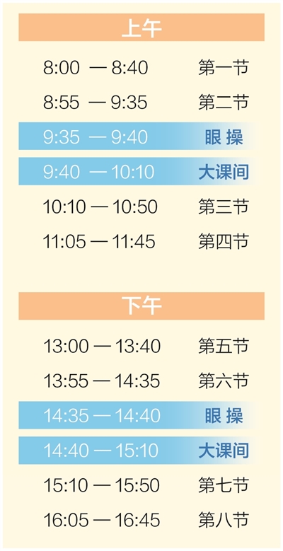 為落實課間時長,沈陽七中把課堂時間從45分鐘調整為40分鐘(見右側表格)。
