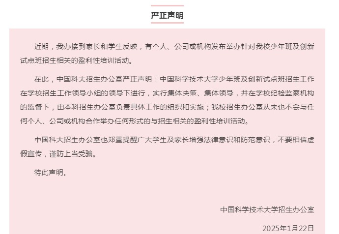 中國科學技術大學招生辦公室1月22日發布嚴正聲明:近期,接到家長和學生反映,有個人、公司或機構發布舉辦針對該校少年班及創新試點班招生相關的盈利性培訓活動。