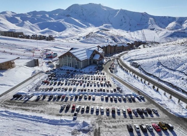 游客的車輛停在新疆阿勒泰將軍山國際滑雪度假區(qū)游客服務(wù)中心旁(2025年1月24日攝,無人機(jī)照片)。新華社記者 胡虎虎 攝