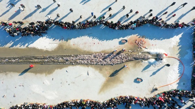一眼望不到邊的查干湖冰面上,口噴熱氣的馬匹拖動絞盤,2000米長的漁網(wǎng)被從湖水中拖出,一條條肥碩的湖魚在冰上搖頭擺尾,捕魚人露出收獲的笑容,圍觀游客發(fā)出陣陣驚嘆與喝彩。