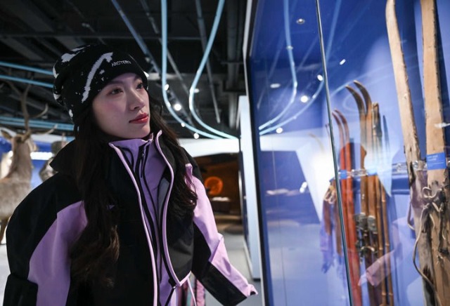 游客在位于阿勒泰將軍山國際滑雪度假區(qū)的人類滑雪起源地博物館參觀(2025年1月28日攝)。新華社記者 胡虎虎 攝