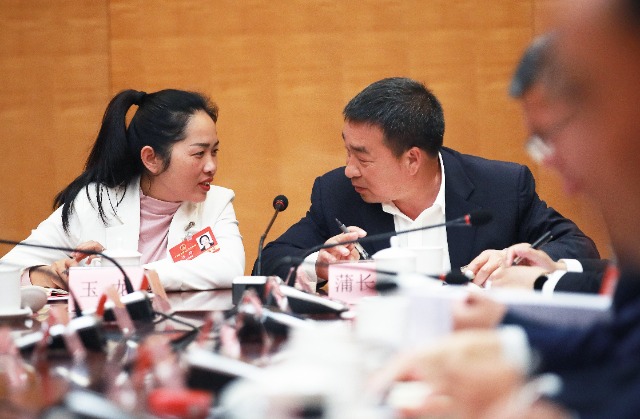3月9日,代表小組會議期間,全國人大代表、云南省勐海縣第一小學教師玉龍(左)和蒲長文代表交流。