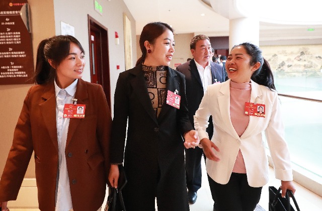 3月9日,上午的小組會議結束后,玉龍(右)和代表們邊走邊交流。