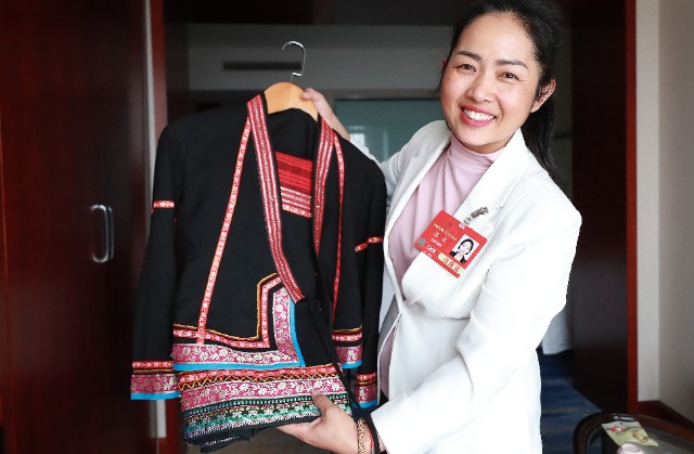 3月9日,玉龍向記者展示代表著春天顏色的布朗族傳統服飾。“我希望穿上民族盛裝參加兩會,展示布朗族的文化魅力,也讓更多人關注少數民族文化的傳承和發展。”玉龍說。