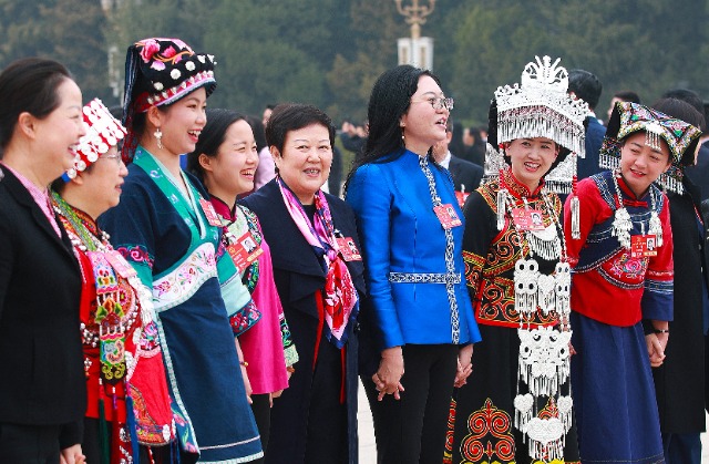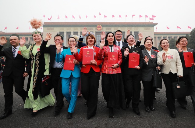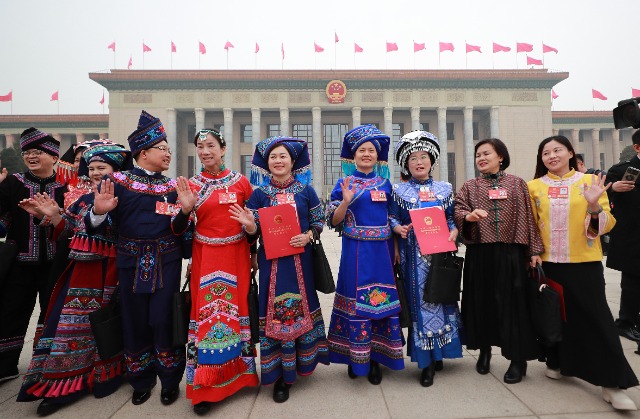 十四屆全國人大三次會議11日下午3時在人民大會堂舉行閉幕會。圖為貴州代表團部分代表進場前獻歌。中國教育報-中國教育新聞網記者 張學軍 攝