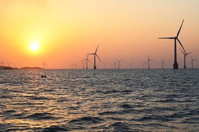 2025年1月19日拍攝的福建莆田平海灣海上風(fēng)電場(chǎng)(無(wú)人機(jī)照片)。新華社記者 林善傳 攝