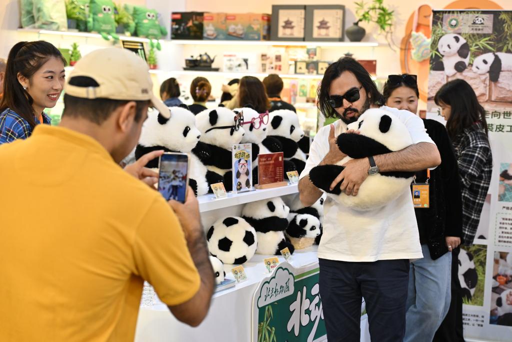 2024年9月16日,參觀者在2024年服貿會首鋼園區文旅服務專題展區抱著北京動物園推出的大熊貓文創玩偶合影。新華社記者 李鑫 攝