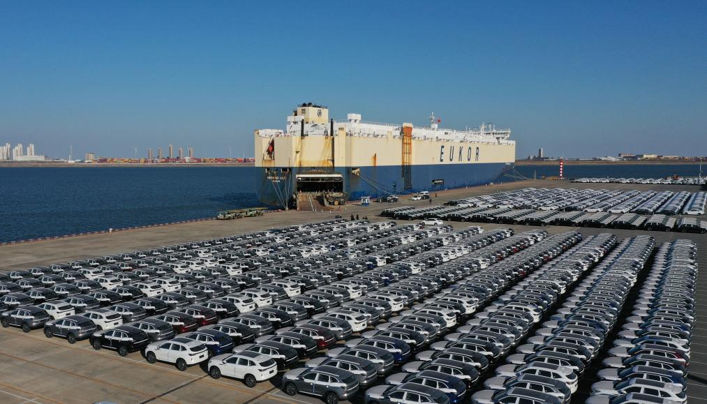 2025年2月25日,來自京津冀地區的超4000輛國產自主品牌汽車在天津港環球滾裝碼頭等待裝船發往海外(無人機照片)。新華社記者 趙子碩 攝