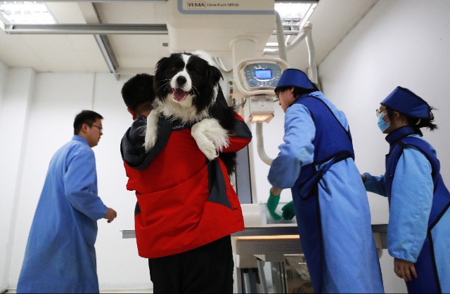 3月23日,揚(yáng)州大學(xué)動物醫(yī)院。郜先生將自家的寵物狗“琪琪”抱到高頻數(shù)字式X光機(jī)檢查臺上。
