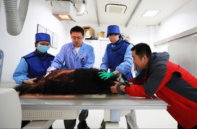 3月23日,揚(yáng)州大學(xué)動物醫(yī)院。郭龍醫(yī)生(左二)在兩名實(shí)習(xí)學(xué)生的協(xié)助下,對“琪琪”進(jìn)行高頻數(shù)字式X光機(jī)的檢查。郜先生在一旁安撫“琪琪”接受檢查。