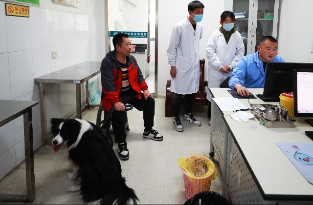 3月23日,揚(yáng)州大學(xué)動物醫(yī)院。市民郜先生抱著自家的寵物狗“琪琪”前來就診。李俊醫(yī)生(右一)聽完郜先生的主訴后,讓給“琪琪”做個高頻數(shù)字式X光機(jī)檢查。