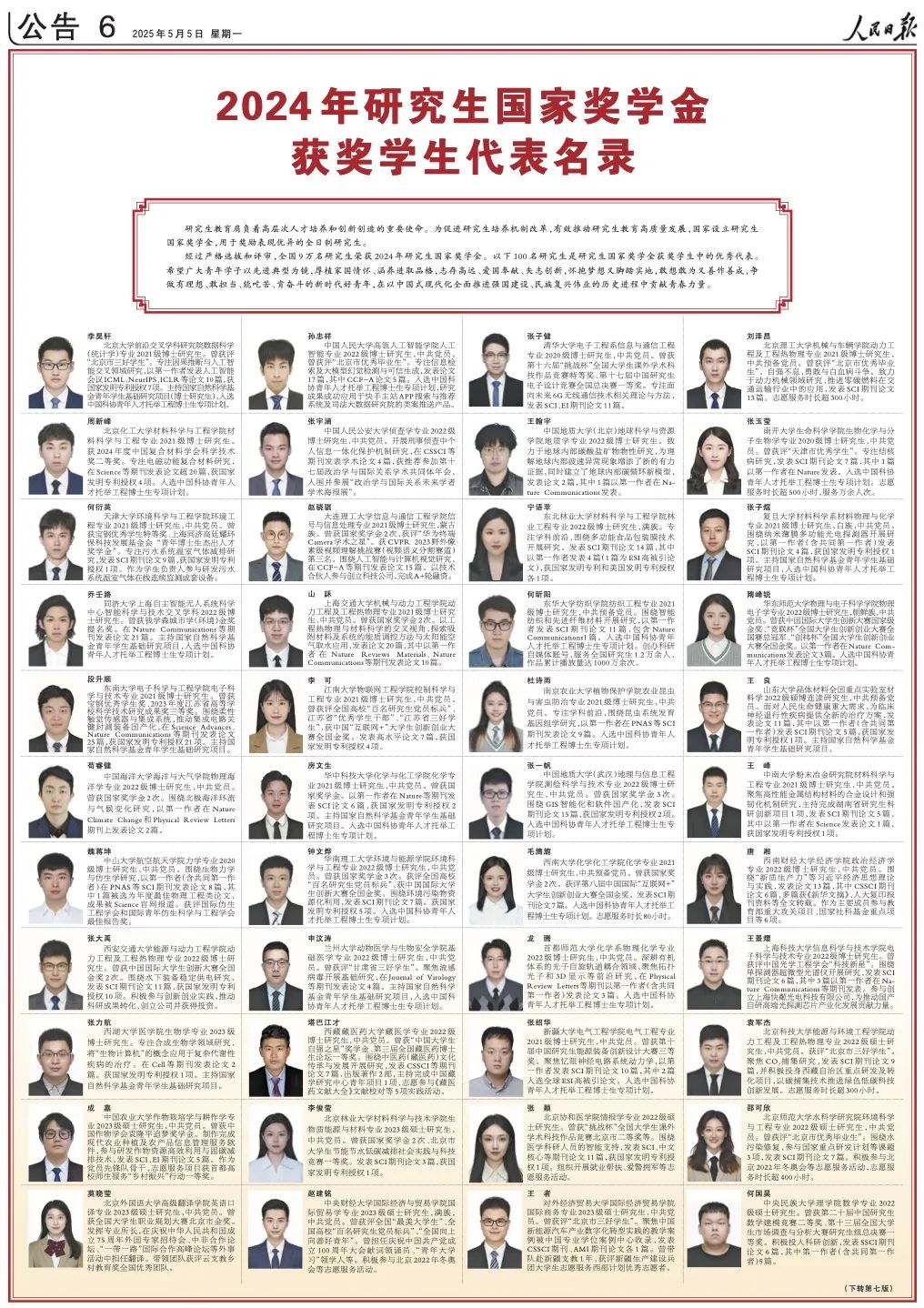 5月5日,《人民日報》專版刊登《2024年研究生國家獎學金獲獎學生代表名錄》,展示研究生國家獎學金獲獎學生中的100名優秀代表的風采。跟教育小微一起來認識一下他們吧↓↓↓