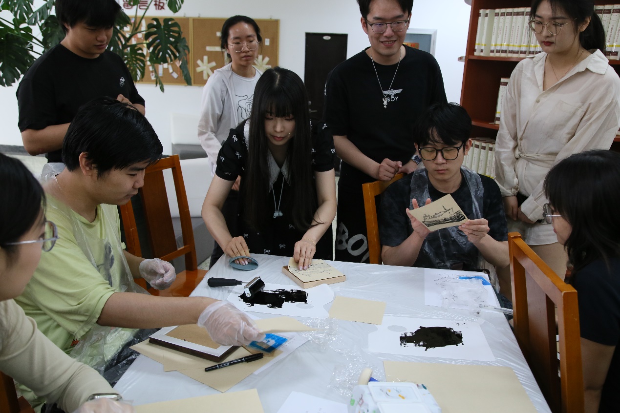 在“古技今用”環節,師生們親身體驗非遺版畫拓印,精心挑選能源主題圖案,如石油鉆井井架、海上石油運輸船舶、沙漠石油工程車、石油工人采油場景、石油化工工廠等,將其印制在木質拓板上。拓印時,隨著拓板一起一落,一幅幅專屬能源版畫成型。師生們喜悅地看著自己的作品,小心翼翼地將版畫捧在手中,成就感油然而生,也對從古至今傳承創新的拓印技術贊嘆不已。