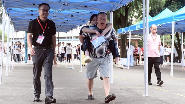 因脊髓炎導致下肢癱瘓的四川資陽考生蔣欣桐,通過綠色通道可提前30分鐘進入考場,父親也被允許在旁協(xié)助進出。