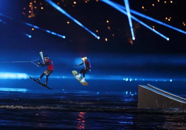 開(kāi)幕式接近尾聲,中國(guó)滑水運(yùn)動(dòng)員以滑水的方式疾馳于湖上,共同點(diǎn)燃主火炬,水火交相輝映,現(xiàn)場(chǎng)再次沸騰。