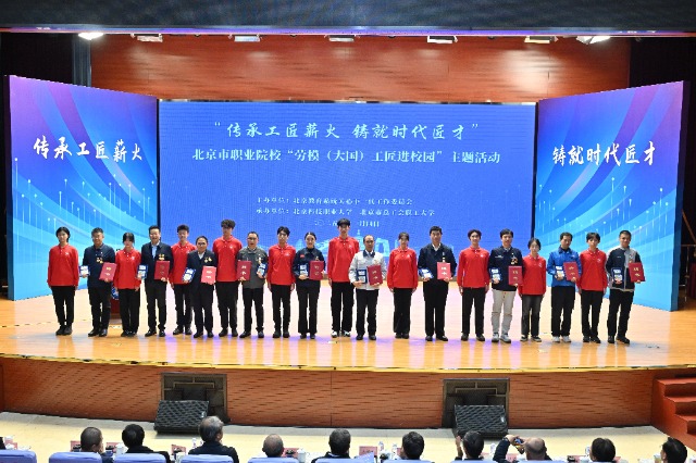 11月4日,北京市職業院校“勞模(大國)工匠進校園”活動中,10名北京科技職業大學的學生為10位勞模工匠頒發“班級工匠導師”聘書。北京科技職業大學供圖