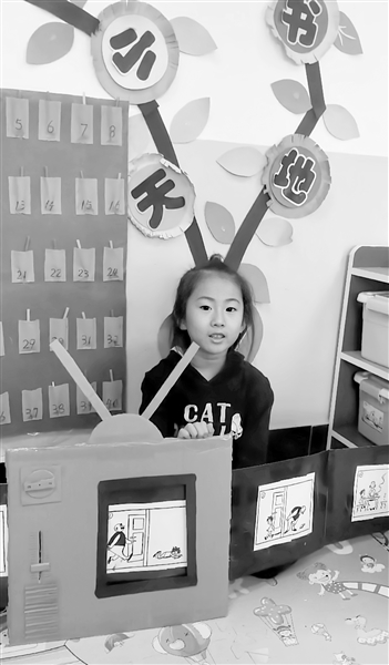 活動過程:播放動畫,首先要有播放的工具,于是我利用科學(xué)區(qū)的紙殼、美工區(qū)的透明膠等,做了一個平面的帶天線的老式電視機模型,并留好了空位置放“膠片”。接下來,我和孩子們一起,選擇用美工區(qū)的黑色卡紙粘貼在背面,把漫畫報每一個故事小節(jié)按順序剪下來,平鋪接好粘貼在黑色卡紙上,制作成“膠片”。在投入使用之前,我們先進行了膠片播放實驗,孩子們爭當(dāng)“動畫”放映員。看到讀物以“動畫”的形式播放,一片快樂的“哇”聲響了起來。每個孩子都嘗試過后,我將“電視機”和“膠片”投放到了閱讀區(qū),和孩子們一起收集、繪制不同故事情節(jié)的內(nèi)容,進行裁剪后做成有趣的“膠片”。