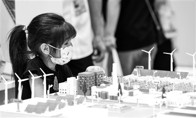 9月3日,在環(huán)境服務(wù)專題展區(qū),一名小學(xué)生在參觀光電碳中和模型。2022年中國國際服務(wù)貿(mào)易交易會(huì)于8月31日至9月5日在位于北京的國家會(huì)議中心和首鋼園區(qū)舉辦,今年更加突出“雙碳”主題,新設(shè)環(huán)境服務(wù)專題展,全面展示生態(tài)環(huán)保、綠色節(jié)能技術(shù)和應(yīng)用。