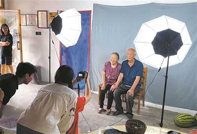 兩間平房、兩塊幕布、幾把椅子,師生們就地取材,在村委會搭起一間簡易攝影棚。拍攝時,大多數(shù)村民面對鏡頭會選擇懷抱一筐紅棗、甜杏,或手握鋤頭、鐵耙?!斑@正是我們想定格的屬于勞動者的美麗?!睂W生梁沁深有感觸地說。