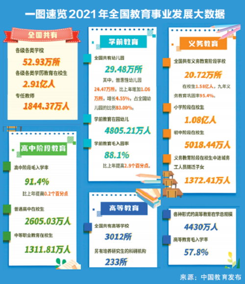 公報指出,2021年是黨和國家歷史上具有里程碑意義的一年。在黨中央、國務院堅強領導下,教育系統堅持以習近平新時代中國特色社會主義思想為指導,全面貫徹黨的十九大和十九屆歷次全會精神,沉著應對百年變局和世紀疫情,積極推進教育事業改革發展,構建新發展格局邁出新步伐,高質量發展取得新成效,實現了“十四五”良好開局。