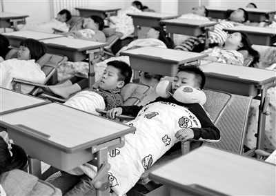 近日,河北省秦皇島市海港區在水一方小學學生使用可調節午休課桌椅休息。