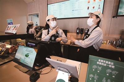 7月4日,“無聲咖啡師”公益培訓項目學員、聽障咖啡師王茹(右)和聽障咖啡師李莎通過手語交流。每年9月的第四個周日是國際聾人日。在陜西省城市經濟學校,新一期主要面向聽力殘疾人的“無聲咖啡師”公益培訓正在進行,這將為他們日后在這一領域的創業與就業鋪平道路。新華社記者 李一博 攝