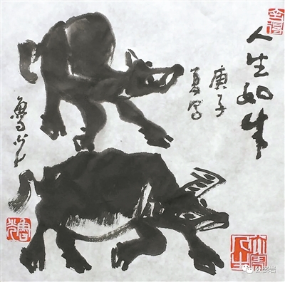 2015年,家鄉浙江省永康市人民政府建立了一所魯光藝術館,展館序言請他題個字,他揮筆寫下四個字就是“人生如牛”。“魯光畫牛”“魯光真牛”“魯光如牛”,是美術界及朋友們的共識。他寫牛、畫牛就是在畫自己,融入自己的情感和感悟。老朋友何君華曾為魯光畫過一幅漫畫,頭上就有兩只牛角。還有幾位老朋友畫他,干脆就是人面牛身。更有朋友撰文“魯光兄專攻牛屁股兩年之久”,直書他畫不好決不罷休的韌性……我曾在供職的《北京晚報》名家版約來魯光朋友們寫他們眼中的魯光,用兩版通欄標題《魯光:屬牛 愛牛 畫牛 做牛》刊發,這是我眼中的魯光先生。