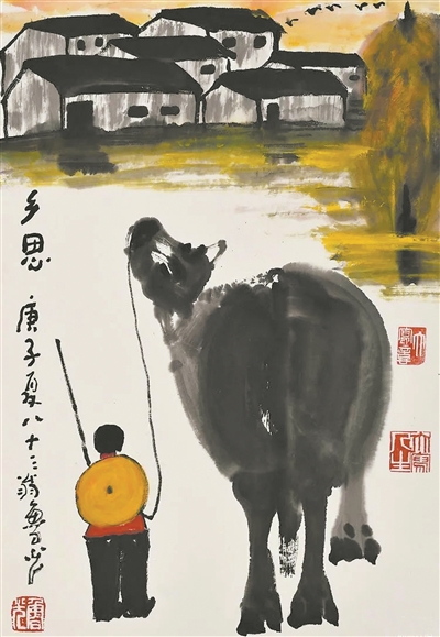 久居鬧市,過著樓房電梯的現代生活,紙上牧牛的畫牛翁,常常懷念小時候放牛娃的生活,把牛趕到山上吃草了,自己要么在陰涼地睡覺,要么爬樹、下河摸魚,于是,那深藏在心的泥墻黑瓦的老屋、池塘嬉戲的群鵝、晚歸的牧童,帶著泥土味、思鄉情鮮活誕出。余興未平中又通過網絡傳給一位位朋友,我收到看到感受到含量百分百的質樸和童趣。逢年過節,他也會傳來手作寫意的“魯氏粽子”“魯氏月餅”,“父親節”隆重曬出父女合作的扇面。我想,此刻他一定是靈感橫溢、幸福爆棚,微醺地進入了繪畫的最高境界——得意忘形。從一幅幅又一幅幅新作中,我看到的是老房新貌、老樹嫩姿、老牛萌態、老翁童心……