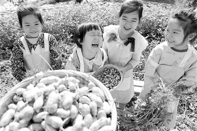10月8日,在山東省高密市密水街道中心幼兒園,孩子們展示采摘的花生。正值寒露節氣,該園開展“花生采摘樂 萌娃慶豐收”活動,孩子們在教師帶領下來到校園微農場里,拔花生、采摘花生、分享花生,感受豐收的喜悅和勞動的艱辛。