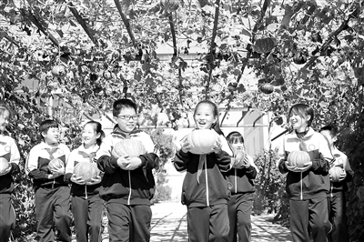 10月10日,河北省唐山市豐潤區新軍屯鎮溪歌莊小學學生在校園搬運收獲的南瓜。金秋時節,該校在校園里種植的農作物迎來豐收,孩子們在忙碌中感受勞動的艱辛和豐收的快樂。朱大勇 攝