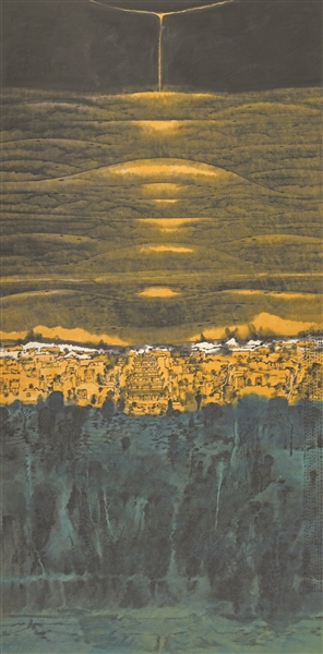 作品通過圖像語言確立山水畫中的內部支撐關系,引向畫面中心最具代表性的建筑圖像,如敦煌唐代第96窟的九層窟檐,神形皆有,巍峨壯觀,是《永遠的敦煌》畫作中的標志性建筑,周圍掩映的窟群大小各異,疏密有致,巧施變化于均衡關系中。將千年莫高窟植進宇宙洪荒的黑黃背景中,大面積色塊渲染的空間傾瀉而下,置身枝葉縱橫的茂林叢中遠眺,高低錯落,一覽無余,仿佛靈光照映禪意神秘的蒼茫大地。物理學家楊振寧稱贊盧禹舜的鴻篇巨作參透宇宙奧妙,莊子“天地有大美而不言”,盧禹舜的“敦煌”亦是如此,內心不懈追求天地大美的審美意趣,充滿對傳統文化精神的崇高敬仰。大漠荒原中的奇觀萬象,如同穿越時空般躍然紙上,成為傳遞心象的水墨圖景,展開曠野宏大的視覺空間,傳達山水嶄新的意境氣息,山水元素被賦予當代文化象征的精神意蘊和文化基因。天地萬象、乾坤大義,時空共融于淋漓氤氳的繪畫語言,畫盡北方山水的蒼茫之意與濃潤之感,層層相疊的自然山水如超越空間的循環往復,從地面一直延伸至遠處天際延綿不斷,構成宇宙萬物的天地精華。水墨暈染,渾厚華滋,精妙渲染酣暢雄渾的外部世界,曠達無垠,清凈無塵。經過筆墨、虛實、意境烘托超越自然空間的神韻、品格、意趣的悠遠意境,彌漫山色朦朧隱現,表達光影神秘虛幻般的似真似幻,儼然擇一處世外桃源,觀照心靈的樂土,縈繞在觀者生命里巍然矗立的盛世之光。