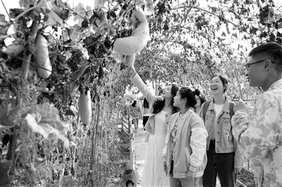 11月2日,在浙江農(nóng)林大學(xué)校園農(nóng)作園里,學(xué)生正在觀賞成熟豐收的農(nóng)作物。浙江農(nóng)林大學(xué)校園有近百畝農(nóng)作園,學(xué)校鼓勵(lì)學(xué)生們在課余時(shí)間種瓜種菜,開展生產(chǎn)勞動(dòng),學(xué)習(xí)農(nóng)業(yè)知識,增強(qiáng)對農(nóng)業(yè)的感情。
